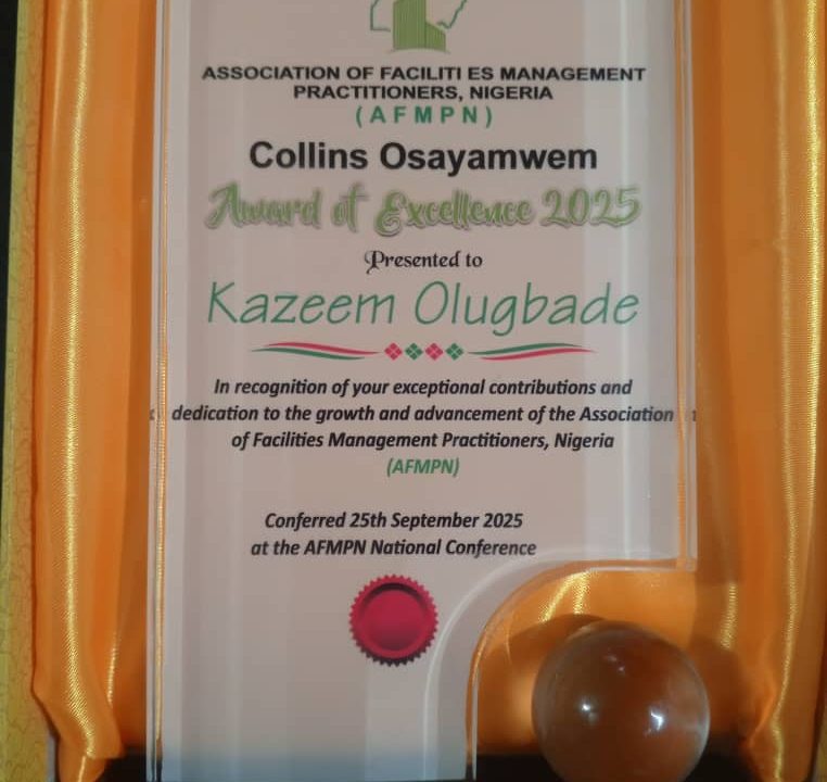 I am deeply honoured to be named one of the recipients of the “Collins Osayamwen Award of Excellence 2025”, an award organized by the Association of Facilities Management Practitioners, Nigeria (AFMPN) in memory of the late Mr. Collins Osayamwen, the first president of the Association. This recognition is not just a personal milestone but also a call to keep working towards advancing the profession of Facility Management (FM) in Nigeria, Africa, and beyond.